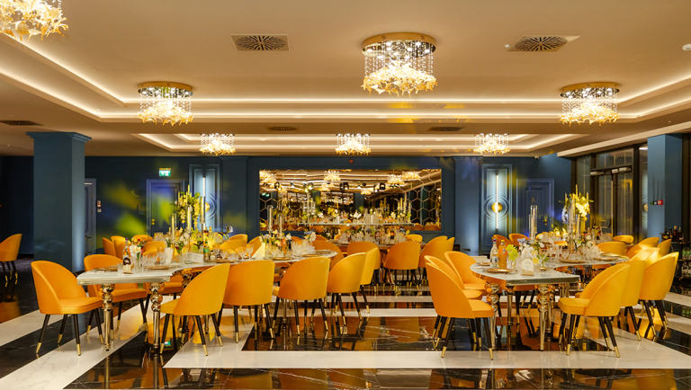 Eleganță pură și rafinament desăvârșit , situat la parter, impresionează prin decorul său sofisticat și culorile aurii, care reflectă perfect conceptul de lux al Palace by Orient. Cu o capacitate generoasă, este alegerea ideală pentru nunți, recepții sau evenimente corporate.